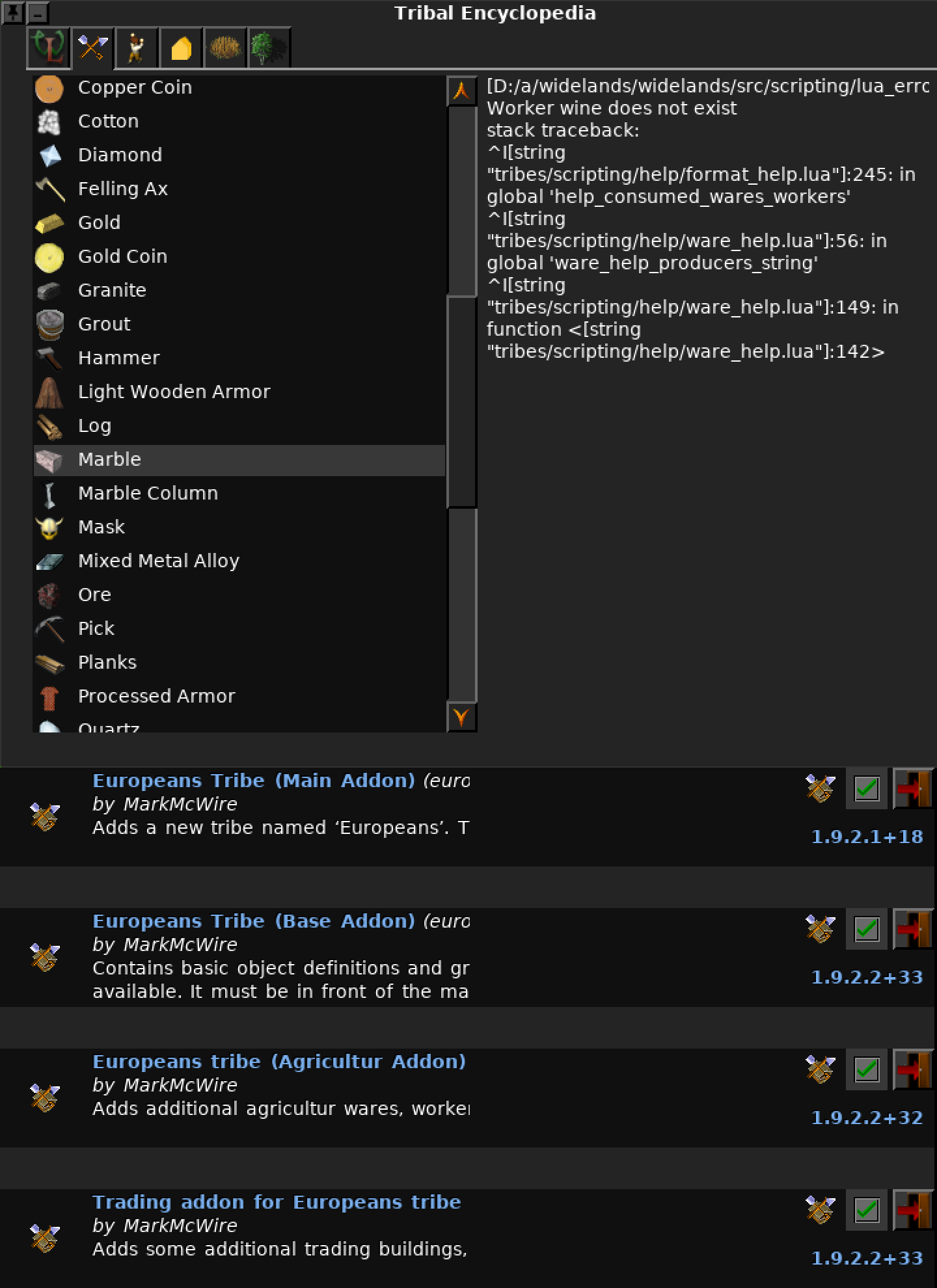 I need a screenshot from the error for debugging. My widelands addons: https://drive.google.com/file/d/1jopANlODo41T2reHJ0zaCOMYxq_rxXP-/view?usp=sharing  Top  Quote |