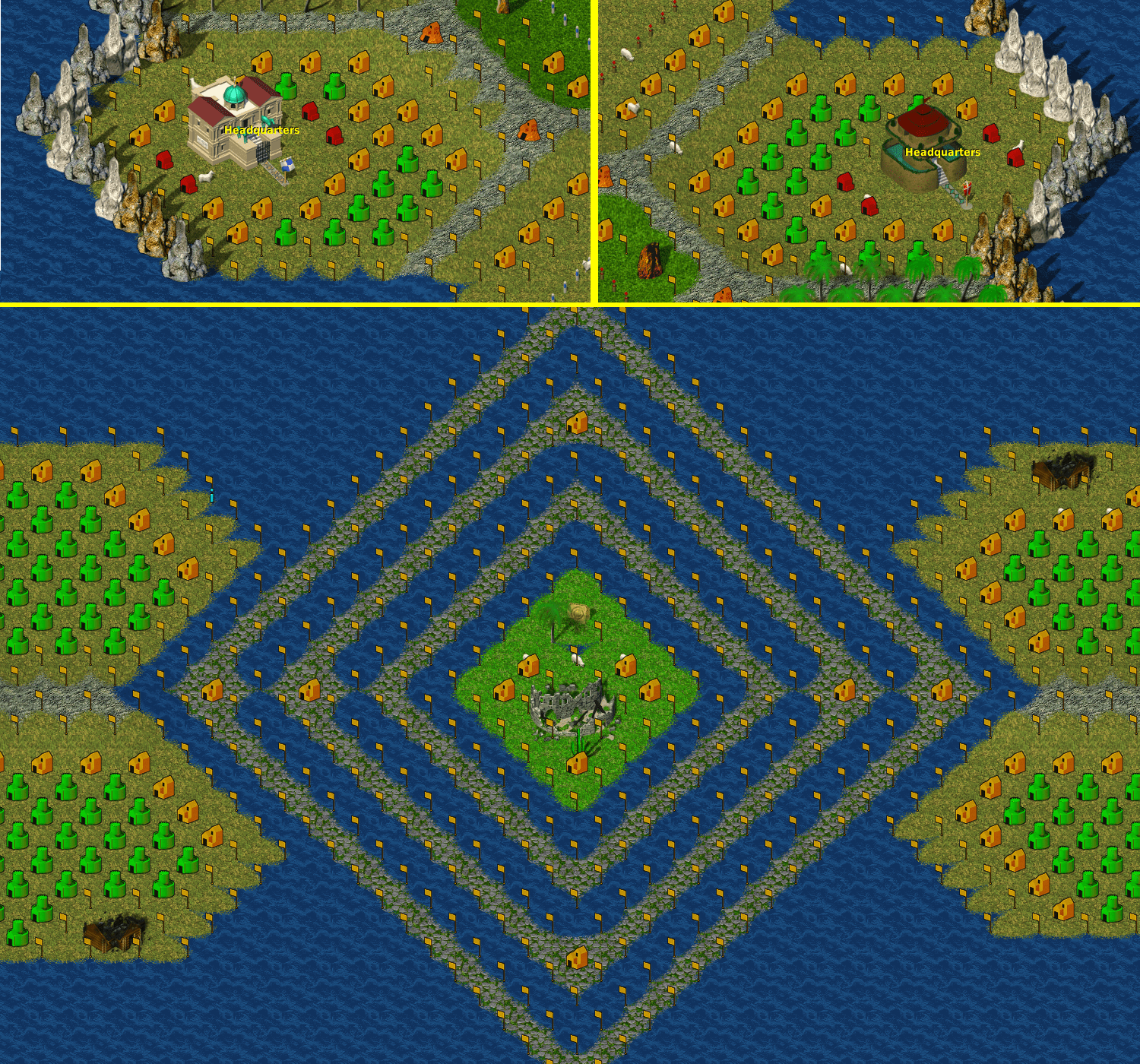 OK, I've uploaded Inselkrieger with my edits. I think my anti-blocking edits already made sure you can get beyond the middle island. edit: Oops, I forgot to actually test those anti-blocking edit before uploading. Tested now: they're not enough. I tried adding some immovables at the nearest big spots to prevent castles, but they're not quite enough, need to work on them more, but then that changes the map too much…