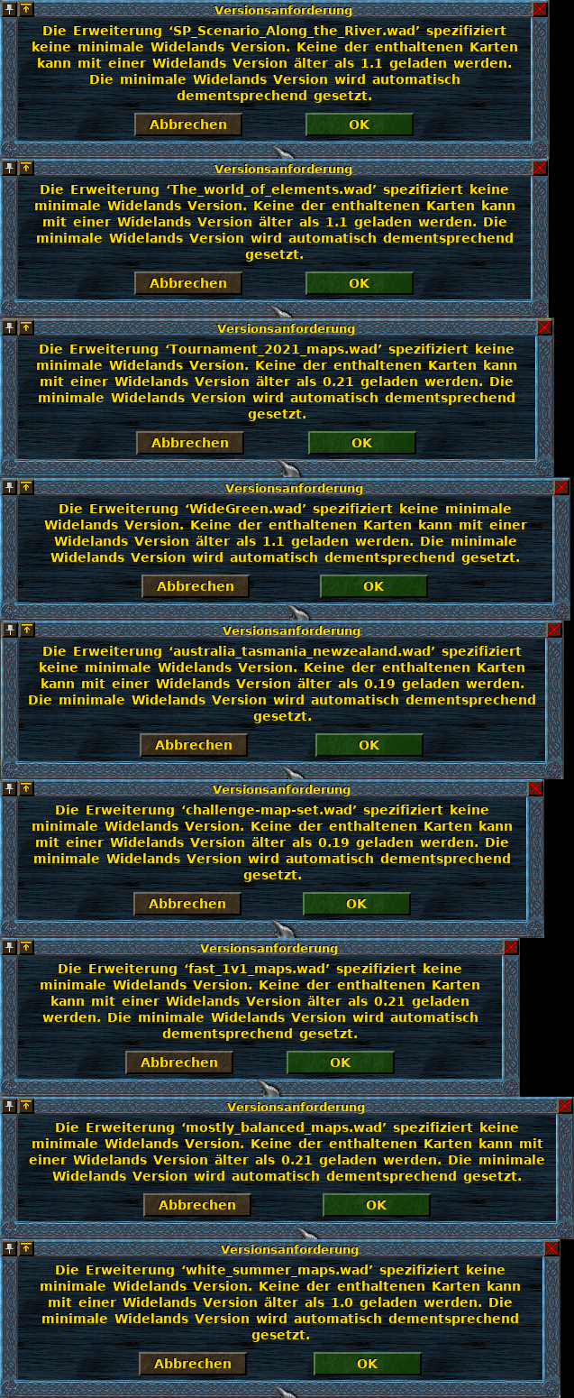 Das Prüfsiegel wird vergeben von … mir Theoretisch kann jeder Add-Ons-Server-Moderator das ändern, praktisch bin ich m.W. der einzige der Add-Ons moderiert. Manche meiner Add-Ons (Frisians Economy Ultra, Foreign Planet, Editor Swap Terrains) schreibe ich mit dem ausdrücklichen Ziel, anderen Autoren ein reales Beispiel und eine Vorlage zu geben, wie ein Add-On mit allen Best Practices im Idealfall aussehen könnte. Für die setzte ich dann auch direkt die goldene Flagge. Selbstverständlich sind Beschwerden direkt an mich möglich, wenn die begründete Meinung besteht, dass ich irgendwo unfair bin. Das Add-On editor_swap_terrains ist ausdrücklich mit "Benötigt mindestens Widelands-Version 1.2" gekennzeichnet. Die aktuelle Entwicklungsversion ist nicht 1.2, sondern schlicht ein kleines bisschen zu alt. Mit 1.2 wird dieses Add-On funktionieren, mit der 1.2~Tournament2023 eben noch nicht. Da braucht man schon die allerallerneueste Version aus diesem PR. Bei deinem Add-On hab ich den Vermerk mit den Desyncs direkt nach dem Reviewen rausgenommen. Allerdings musst du ggf. deine lokale Version des Add-Ons durch die vom Server ersetzen, damit das Flag auch lokal aktualisiert wird. Übersetzung für dein Add-On ist zumindest auf Plattdeutsch und Niederländisch schon komplett, auf Deutsch derzeit 77% vollständig.