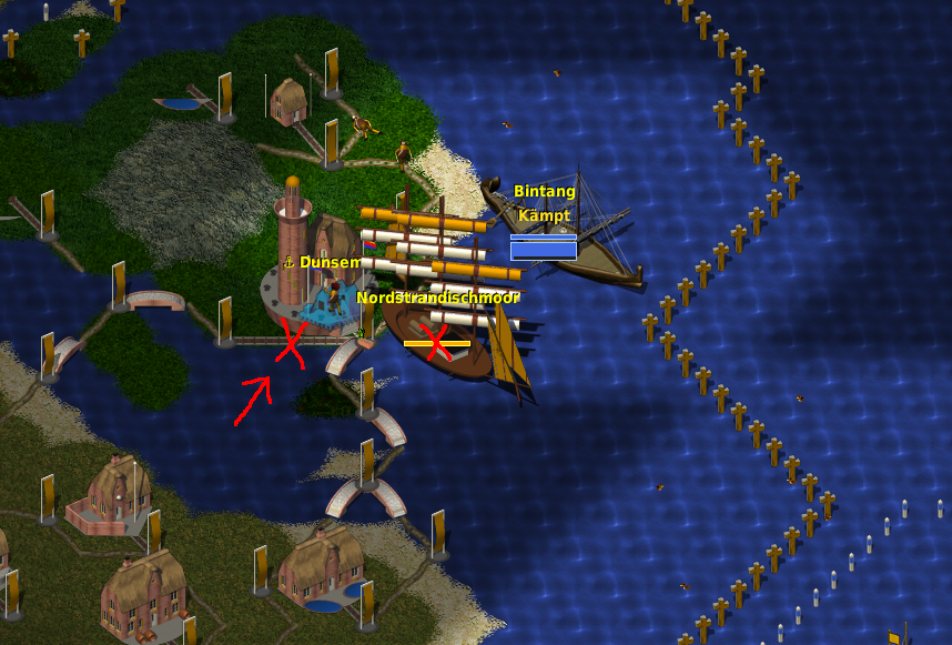 Hab mir die Situation angeschaut. Und zwar müssen sich zu Beginn des Kampfes die beiden Schiffe so positionieren, dass der Angreifer (Sumatraner) 2 Knoten links vom Verteidiger (Friese) steht (Abbildung linkes rotes Kreuz). Wenn möglich, versucht der Angreifer, dorthin zu gehen, und der Verteidiger bleibt wo er ist. Wenn es nicht möglich ist, bleibt stattdessen der Angreifer, wo er ist, und der Verteidiger geht auf den Knoten 2 rechts vom Angreifer.